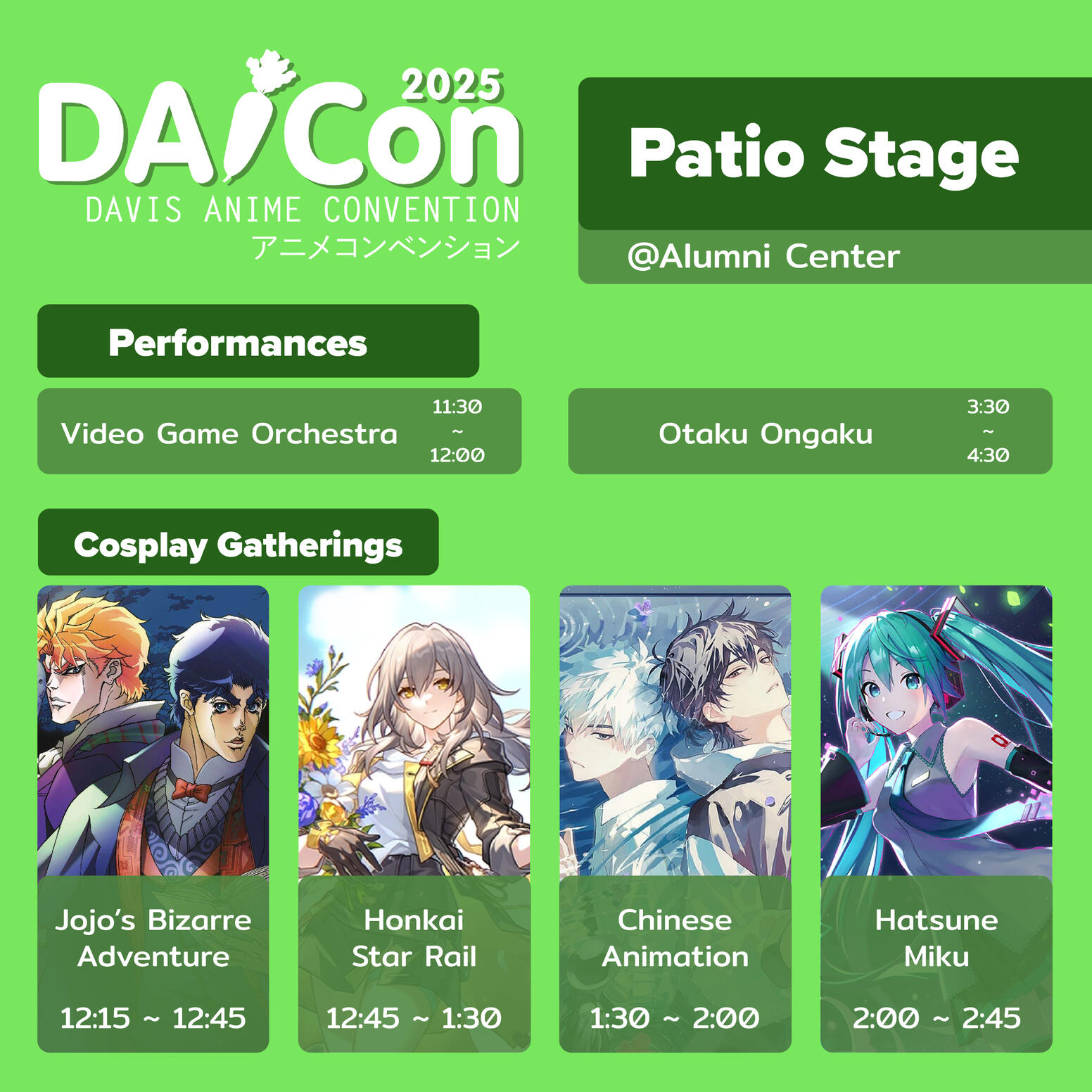 Here is the schedules for stage performances and cosplaying gatherings held at the Alumni Center Moss Patio!